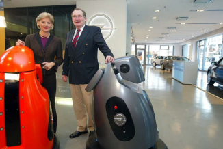 Klaudia Martini mit dem Leiter des Fraunhofer-Instituts für Produktionstechnik und Automatisierung IPA, Prof. Dr.-Ing. Dr. h.c.mult. Rolf Dieter Schraft sowie Mona (rot) und Oskar (anthrazit). Rüsselsheim/Berlin - Neue Attraktion im Marken- und Kommunikations-Zentrum "Opel in Berlin": Die beiden Roboter MONA und OSKAR führen die Besucher durch die Ausstellungsräume und liefern dabei nützliche und unterhaltsame Informationen rund um die Adam Opel AG. MONA (Multifunktionale Opel Navigatorin) und OSKAR (Opel Systemkreation aus Rüsselsheim) wurden vom Fraunhofer Institut für Opel entwickelt. Die beiden Roboter können unterschiedliche Aufgaben übernehmen. MONA begrüßt die Besucher am Eingang und zeigt ihnen den Weg zur Ausstellung. In der Ausstellung selbst kommt OSKAR zum Einsatz. Er unterhält die Gäste und fordert sie auf, über den Touchscreen an seinem Bauch weitere Informationen abzurufen. Treffen sich die Roboter, dann reden sie miteinander oder begrüßen gemeinsam neue Gäste. Hinter dem witzigen und charmanten Auftritt der Roboter steckt eine ausgeklügelte Technik: Mit zweidimensionalen Laserscannern an der Vorder- und Rückseite - den Augen der Roboter - nehmen MONA und OSKAR ihre Umgebung wahr, lokalisieren sich und planen ihre Fahrtroute. Zusätzlich haben die Roboter eine Karte ihrer Arbeitsumgebung gespeichert. Diese Umgebungskarte wird mit den Informationen des Laserscanners abgeglichen und so die aktuelle Position des Roboters bestimmt. Auch Hindernisse werden mit Hilfe des Laserscanners erkannt und der errechnete Pfad so modifiziert, dass die Roboter in einem angemessenen Abstand um die Besucher herumfahren. (27. Oktober 2003)