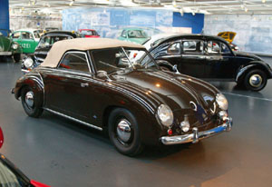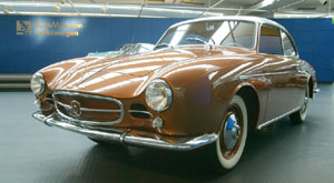 Beutler, Baujahr 1957 Sogar noch teurer als ein zeitgenössischer Porsche geriet der Spezial Volkswagen mit Aluminium-Karosserie, den die Gebrüder Fritz und Ernst Beutler 1957 im Schweizer Thun fertigten: 14.950 Schweizer Franken kostete schon das Basismodell mit Volkswagen-Technik (1192 ccm/30 PS). Der Sonderausstellungs-Beutler, eine Leihgabe der Autostadt und in deren Auftrag komplett restauriert, profitierte indessen von der Großzügigkeit seines Erstbesitzers: Unter seiner Heckhaube tönt ein 75 PS-Triebwerk aus dem Porsche 356 A 1600 Super (damaliger Aufpreis: SFr 3.600), verzögert wird mit einer Porsche-Bremsanlage (damaliger Aufpreis: SFr 1.200). So gerüstet kann gefahrlos die Höchstgeschwindigkeit von über 160 km/h ausgelotet werden - und das sogar mit drei Passagieren an Bord. Denn die Gebrüder Beutler suchten gezielt die Lücke zwischen Volkswagen und Porsche: (fast) so geräumig und praktisch wie ein Käfer, (fast) so flink wie ein Porsche - und dabei so individuell in der Form wie zeitgenössische Exoten.