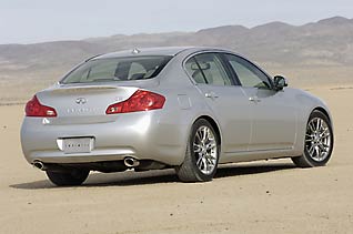 Das Exterieur des neuen Infiniti G35 folgt dem Vorbild des Vorgängers: Die Proportionen sind betont athletisch, die Linien dabei schnörkellos und die für die Marke charakterischen Designzitate prägnant gesetzt. Dazu zählen die skulpturartig geformten Kühlergrillrippen, die L-förmigen Hauptscheinwerfer und Rückleuchten sowie die jetzt noch deutlicher ausgeprägte seitliche Lichtkante. Sie steigt sanft nach hinten an und unterstreicht so auch optisch das Heckantriebskonzept - der G35 schiebt unübersehbar von hinten an.
