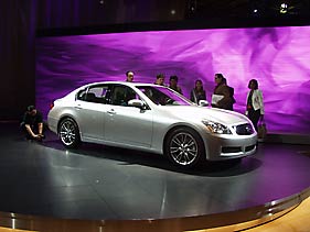 Auf Wunsch bietet Infiniti den auf der FM-Plattform (Front Midship) von Nissan basierenden G35 auch mit Allradantrieb an. Das Fahrwerk zeichnet sich durch einen hohen Anteil an Leichtmetall-Komponenten aus und kommt dank vorderen und hinteren Einzelrad-aufhängungen einer sportlichen Fahrweise entgegen. Zu den wichtigsten Komfort- und Sicherheitslösungen zählen das drahtlose Zugangssystem samt Starterknopf am Armaturenbrett, adaptive Scheinwerfer, eine optionale Holzausstattung für das Interieur und ein Abstandskontrollsystem, das automatisch verzögert, wenn der Abstand zum Vordermann zu sehr schmilzt. Photos: Nissan/Infiniti (14. April 2006) |