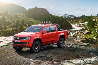 Für weitere optische Akzente sorgen die abgedunkelten Rückleuchten und der farblich abgesetzte Unterfahrschutz. Zwei elektrisch ausfahrbare Trittstufen ermöglichen trotz der Höherlegung ein bequemes Ein- und Aussteigen für alle Passagiere. Die Trittstufen wurden optisch unauffällig integriert, durch das Einklappen nach Fahrtbeginn bleibt die bekannt hohe Offroad-Fähigkeit des Amarok Canyon unverändert erhalten. Wie skizziert, ist das auf Outdoor-Aktivitäten getrimmte Concept Car auch in der Breite gewachsen. Um Platz zu schaffen für die üppigen AT-Reifen in der Dimension 275/65 R 18 auf im Farbton „High Gloss Adamantium Dark“ lackierten Felgen vom Typ „Durban“, wurden die Radhäuser um 35 Millimeter je Seite verbreitert. Auf der Ladefläche werden die beiden Karbonfaser-Kajaks sicher befestigt: das Heck wird in zwei ausgeformte und soft verkleidete Aussparungen in der Ladefläche geführt, der Bug wird an der in „High Gloss Adamantium Dark“ lackierten Styling-Bar mit Gurten rutschfest gesichert. Die Paddel werden in der Innenseite der leichtgängigen Heckklappe sicher und griffbereit arretiert. Auch die weiteren Utensilien wie Wildwasserhelm, Schwimmweste und Rafting-Schuhe finden einen festen Platz: die Helme in Netzen an der Stirnseite der Ladefläche, alles Weitere in kleinen Boxen, die mit wasserdichten Hauben verschließbar sind. Im Innenraum wurden durch eine spezielle Farbgebung vieler Details neue Akzente gesetzt. Die Ledersitze sind zweifarbig gestaltet: die Sitzflächen sind im Farbton „sterling“ gehalten, die Kopfstützen und Seitenwangen im Farbton „adamant“ heben sich elegant davon ab. Die Ziernähte an den Sitzen nehmen den orangen-roten Farbton der Karosserie auf. Dieser farbliche Aspekt findet sich auch an zahlreichen Details wie an den Nähten des Dreispeichen-Lenkrads und des Schalthebels, an den Sicherheitsgurten und an den Luftausströmern wieder. In einer Hutze auf dem Cockpit sind drei Zusatzinstrumente beherbergt. Diese zeigen die Steig- und Kippwinkel des Amarok an und geben so den Insassen bei extremen Geländefahrten eine zusätzliche Sicherheit. Um eine maximale Offroad-Tauglichkeit zu ermöglichen, wird die Amarok-Studie vom durchzugsstarken 2.0 TDI-Biturbo mit 132 kW / 180 PS angetrieben, der über ein maximales Drehmoment von 400 Newtonmetern bei 1.500-2.250 U/min verfügt. Für die Übertragung dieser Kräfte auf die schwierigsten Untergründe sorgt der zuschaltbare Allradantrieb 4MOTION mit Untersetzungsgetriebe und Sperrdifferential an der Hinterachse. Photo: VW (05.03.2012)