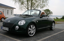 Sein spritziges Design verschaffte ihm bereits 2004 den international anerkannten „red dot design award“. Angetrieben wird der nur 850 kg leichte Open-Air-Flitzer von einem 1,3-Liter-Motor mit 64 kW / 87 PS. In 9,5 Sekunden sprintet er von 0 auf 100 km/h, die Höchstgeschwindigkeit liegt bei 180 km/h. Sein Durchschnittsverbrauch beträgt 6 Liter auf 100 Kilometer, die CO2-Emissionen werden mit 140 g/km angegeben. Das Leergewicht des Copen beträgt nur 850 kg. Das gut abgestimmte manuelle Fünf-Gang-Getriebe zeichnet sich durch kurze und präzise Schaltwege aus. Preislich startet der Copen „100th Anniversary“ in Silber Perleffekt und Stahlgrau Perleffekt ab 19.690 Euro, in Dunkelgrün ist er ab 19.790 Euro zu haben. Insgesamt ist der Copen ein origineller und bemerkenswert dynamischer Roadster mit einem äußerst agilen Fahrverhalten, sowohl auf geraden Strecken als auch in Kurven lässt er sich sportlich und präzise handeln. (2. Mai 2007)