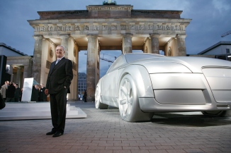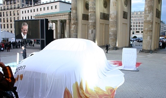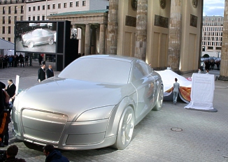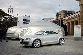Enthüllung vor dem Brandenburger Tor und Weltpremiere des neuen Audi TT Coupés Als offizieller Partner der Initiative "Deutschland - Land der Ideen enthüllte die AUDI AG und die FC Deutschland GmbH am gestrigen Donnerstagabend direkt vor dem Brandenburger Tor in Berlin die Plastik "Das Automobil". Die überdimensionale Autoskulptur im Maßstab 2,5:1 gehört zum "Walk of Ideas", den sechs Skulpturen an prominenten Plätzen in Berlin bilden und der bis zum Herbst zu sehen sein wird. |