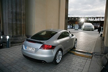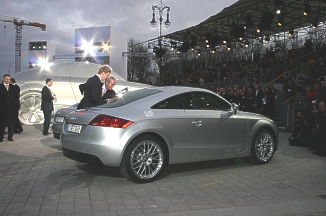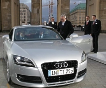Prof. Dr. Martin Winterkorn, Die Fahrzeugskulptur steht als Symbol für das "Autoland Deutschland", so erläuterte Prof. Dr. Martin Winterkorn, Vorsitzender des Vorstands der AUDI AG. "Die Initiative 'Deutschland - Land der Ideen' entspricht hervorragend unserem Markenkern 'Vorsprung durch Technik'. 45.000 hoch qualifizierte und motivierte Mitarbeiter in unseren deutschen Werken Ingolstadt und Neckarsulm machen unseren Erfolg möglich. Audi bekennt sich zum Standort Deutschland. Insofern passt unser Engagement sehr gut zu den Zielen der Initiative. Denn wir entwickeln und produzieren hier in Deutschland mit Ideenreichtum und Begeisterung faszinierende Autos." Aber die Enthüllung blieb nicht die einzige Sensation des Abends. Audi nutzte die Gelegenheit zur Weltpremiere für das neue Audi TT Coupé. 1998 rollte dieser inzwischen zum Kultauto avancierte Sportwagen seinerzeit an den Start, jetzt folgt die zweite Generation. Zwei Modelle des neuen Sportwagens fuhren vor dem Brandenburger Tor vor. Der neue TT deutlich gewachsen und zwar um fast 14 Zentimeter in der Länge, die jetzt 4,18 Meter ausmacht und um beinahe acht Zentimeter in der Breite auf 1,84 Meter. Die Karosserie entsteht in der von Audi entwickelten Space-Frame-Bauweise ASF aus Aluminium und Stahl. Als neues Markenkennzeichen der Audifamilie bekommt nun auch der TT einen Singleframe-Kühlergrill und einen bei 120 Stundenkilometer ausfahrenden Heckspoiler zur Erhöhung des Abtriebs. Der Kofferraum fasst 290 Liter Gepäck und wächst durch Umklappen der Rücksitzlehnen auf 700 Liter Volumen. Zur Serienausstattung des neuen Audi TT zählen eine Klimaautomatik und ein im unteren Teil abgeflachtes Sportlederlenkrad. Dieses passt nicht nur hervorragend zum Sportwagen, sondern erleichtert auch Ein- und Ausstieg.