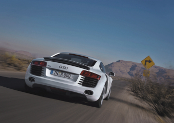 1,90 Meter breit, 4,43 m lang und nur 1,25 Meter hoch, das sind die charakteristischen Proportionen des R8. Von außen wirkt der Fahrzeugkörper des R8 äußerst kompakt, in der Frontansicht flankieren zusätzliche große Lufteinlässe den Audi Singleframe-Grill rechts und links, wobei die vier Ringe erstmals auf der Fronthaube, oberhalb des Grills positioniert sind. An der Oberseite der Lufteinlässe schließen sich bündig die flachen Bänder der innovativen LED-Frontscheinwerfer mit ihrer Klarglasabdeckung an. Hinter den Türen wölbt sich zwischen Schweller und Dachpartie ein großflächiges Luftleitelement, das dem V8 Atem- und Kühlluft zuführt. Das kraftvolle Heck unterstreicht den Eindruck einer Raubkatze vor dem Sprung. Zwei großformatige Diffusoröffnungen im Heckstoßfänger zeigen, wie intensiv die Aerodynamik die Gestalt des Audi R8 prägt. Die vier runden Endrohre der Abgasanlage sitzen paarweise rechts und links oberhalb der Diffusoröffnungen. In das Spiel mit dem Wind greift beim R8 der automatisch ausfahrender Heckspoiler ein. Er unterstützt mit zusätzlichem Abtrieb die Ansaugwirkung, die durch die aerodynamische Gestaltung des Unterbodens und die Diffusoren erzeugt wird. Bei geringeren Geschwindigkeiten fährt der Heckspoiler wieder karosseriebündig ein.