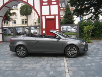 Mit seinem fünfteiligen Cabrio-, Schiebe und Coupédach (CSC-Dach) ist der Eos ein ganzjährig voll funktionstüchtiger Viersitzer, der sich in 25 Sekunden von der geschlossenen in die offene Variante verwandeln lässt. Serienmäßiger Bestandteil ist ein Panorama-Schiebedach, das auch bei schlechtem Wetter für einen lichten Innenraum sorgt. So ist das vordere Segment transparent in Glasoptik ausgeführt und kann entweder separat geöffnet oder um 35 Millimeter hochgestellt werden. Sofern der Eos mit dem Keyless Access ausgestattet ist, erfolgt das Dachöffnen und -schließen mittels Funkfernbedienung. In Deutschland wird der Eos mit drei Turbobenzin-Direkteinspritzern (TSI) und einem TDI angeboten, die ein Leistungsspektrum zwischen 90 kW/122 PS und 155 kW/210 PS sowie 184 kW/250 PS abdecken. Unser Testwagen, der 1.4l TSI mit 90 kW/122 PS erreicht eine Höchstgeschwindigkeit von 198 km/h und erzielt ein maximales Drehmoment von 200 Nm, damit ist man sowohl in der Stadt als auch auf längeren Strecken gut aufgestellt.