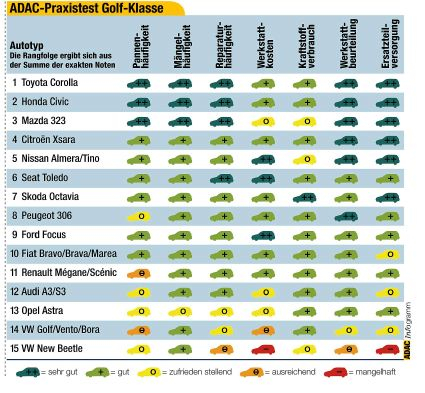 Photo: ADAC München - Rundum zufrieden scheinen die Besitzer japanischer Autos zu sein. Beim aktuellen Praxistest des ADAC, diesmal mit 15 Fahrzeugen der Golfklasse, vergaben die Leser der ADAC-Motorwelt dem japanischen Spitzentrio Toyota Corolla, Honda Civic und Mazda 323 in fünf von sieben Kriterien ein "sehr gut". Note eins bei der Reparatur- Mängel- und Pannenhäufigkeit sowie bei der Werkstattbeurteilung und bei der Ersatzteilversorgung. Dagegen gingen die Leser mit deutschen Fabrikaten streng ins Gericht. Mit zweimal "mangelhaft" bei den Werkstattkosten und bei der Ersatzteilversorgung wurde der VW New Beetle Fünfzehnter und somit Letzter in der Gunst der Motorwelt-Leser. AudiA3/S3, Opel Astra und VW Golf vervollständigen mit den Plätzen 12 bis 14 das Quartett der Verlierer. Einzig der Ford Focus konnte mit Rang neun seine Besitzer einigermaßen überzeugen. Mit dem Praxistest hat der ADAC ein Instrument geschaffen, das die Alltagstauglichkeit von Fahrzeugen darstellt. Diesmal standen 15 Modelle der Golfklasse aus den Baujahren 1998 bis 2001 im Mittelpunkt des Interesses. Über 13 000 Leser füllten den Motorwelt-Fragebogen aus. Heraus kam ein genaues Bild über die Stärken und Schwächen der einzelnen Fahrzeuge. Bei aller Kritik: Unzufriedene oder enttäuschte Wagenbesitzer sind in der Minderzahl. Selbst Schlußlicht New Beetle würden sich 83 Prozent seiner Besitzer wieder kaufen. Am wenigsten markentreu schei-nen Astra-Fahrer. Jeder Fünfte von ihnen wird beim nächsten Autokauf den Typ wechseln. Die treuesten Fans hat der Tscheche aus dem Hause VW. 96 Prozent würden sich wieder für einen Skoda Oktavia entscheiden. (4. Juni 2002). [Home] [ News] [ Diskussion] [ Kalender] [ Jobs] [ Travel & Golf] |