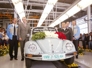 Photo: VW Wolfsburg - Der letzte Käfer ist am heutigen Mittwoch bei Volkswagen de México in Puebla vom Band gelaufen. Mit Blumen und Mariachi-Musik wurde der 21.529.464ste Käfer von der mexikanischen Belegschaft feierlich verabschiedet. Das Erfolgsmodell tritt nun seine letzte Reise über den Atlantik nach Wolfsburg an, wo es im Automuseum einen Ehrenplatz einnehmen wird. Um 9:05 Uhr mexikanischer Zeit wurde die Käfer-Produktionslinie angehalten. Damit geht eine in der weltweiten Automobilhistorie einmalige Erfolgsgeschichte von fast 68 Jahren zu Ende. Mexiko war in den letzten Jahren das einzige Land, in dem der legendäre Käfer, in Mexiko "Vocho" genannt, noch produziert wurde. Der Käfer machte Volkswagen weltberühmt und galt als Symbol des wirtschaftlichen Aufschwungs in Deutschland. Reinhardt Jung, Vorstandsvorsitzender der Volkswagen de México, bedankte sich in einer kurzen Ansprache bei den mexikanischen Mitarbeitern, "die nicht nur an der Produktion eines Autos, sondern auch an der Schaffung einer Legende mitgewirkt haben. Eine Legende, die in den Herzen und den Köpfen all jener bleiben wird, für die der Käfer ein Weggefährte war". Der letzte Käfer ist ein Aquarisblue-farbenes Fahrzeug der "Última Edición", hat einen 1,6-Liter-Benzinermotor und bringt eine Leistung von 34 kW (46PS). Er hat verchromte Zierleisten und Chrom-Anbauteile wie Stoßfänger, Radkappen und Spiegel. Felgen in Wagenfarbe, das Emblem "Última Edición" auf dem Handschuhfachdeckel und das Emblem von Wolfsburg oberhalb des Griffes für die Motorhaube vervollständigen das Bild. Die "Última Edición", von der lediglich eine limitierte Auflage von 3.000 Einheiten produziert wurde, sei auf großen Anklang bei den Kunden gestoßen und bereits so gut wie verkauft, so Jung. Lediglich der letzte Käfer sei unverkäuflich und werde im Automuseum in Wolfsburg seinen Platz finden. Der Käfer ist insgesamt in mehr als 20 Ländern weltweit produziert worden. Allein in Deutschland, wo die Fertigung bereits 1978 auslief, waren es mehr als 16,2 Millionen. In Mexiko, wo der "Vocho" seit 39 Jahren ohne Unterbrechung gebaut wurde, waren es nahezu 1,7 Millionen Fahrzeuge. (30.07.2003)