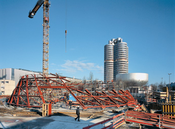 Im Zweischicht-Betrieb sind zur Zeit tagsüber bis zu 200 und nachts bis zu 70 Bauarbeiter und Techniker mit den Stahlbauarbeiten sowie dem Ausbau der Untergeschosse beschäftigt. Pro Tag werden etwa 100 Kubikmeter Beton und 50 Tonnen Stahl verbaut. Am 2. November 2004 war mit dem Setzen der Fußpunkte der Stahlbaukonstruktion für den Doppelkegel begonnen worden. Seit Anfang Februar 2005 wird darüber hinaus die futuristische Dachkonstruktion auf 26 provisorische Rüsttürme gesetzt - bis sich am Ende Dach und Doppelkegel vereinen und selbst tragen können. Auf der Baustelle heben sieben Kräne vorgefertigte Elemente zentimetergenau auf ihren Platz: Strebe für Strebe, Binder für Binder. Vollendet wird das Stahl-Fachwerk des Daches aus nicht weniger als 3.200 Tonnen Stahl sechs bis acht Meter hoch sein und 50 Meter Spannweite überbrücken - das Dach wird dann scheinbar schwerelos über der BMW Welt schweben. Mit der BMW Welt entsteht derzeit in Münchens Stadtteil Milbertshofen an der Ecke Georg-Brauchle-Ring/Lerchenauer Straße ein Gebäudekomplex, der ab Sommer 2006 das Portal zur Marke BMW sein wird. Nach der Fertigstellung werden jährlich rund 850.000 Besucher in dem visionären Gebäude erwartet, darunter viele BMW Kunden, die ihr neues Fahrzeug direkt beim Hersteller entgegennehmen wollen. Dabei besteht die Möglichkeit, mehr über Modelle, Innovationen und zusätzliche Angebote der Marke zu erfahren. So bietet das Gebäude auch Raum für Events und Kongresse, einen Erlebnisbereich für Kinder und Jugendliche sowie Shops und Gastronomie. Werksführungen und ein Besuch im neuen BMW Museum runden das Erlebnis ab. Die BMW Group investiert in das gesamte Projekt über 100 Millionen Euro; insgesamt entstehen in der neuen Anlage rund 200 Arbeitsplätze. Die Stationen der BMW Welt auf einen Blick: August 2003 - Abbruch des Parkhauses, Juli 2004 - Grundsteinlegung, Mitte 2006 - Baufertigstellung. (9.3.2005) |