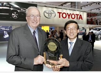 Preisverleihung durch J. D. Power auf der IAA : Firmengründer und Chairman Dave Power mit Toyota Deutschland Präsident Yoichi Tomihara Köln/Frankfurt - Preisverleihung auf dem Toyota-Stand der Internationalen Automobil-Ausstellung: J.D. Power and Associates, renommiertes Marktforschungsinstitut (USA), hat heute Toyota fünf Preise zur höchsten Kundenzufriedenheit überreicht. Toyota ist zum vierten Mal in Folge Gesamtsieger der Verbraucherstudie über die Zufriedenheit der Deutschen mit ihrem Auto. Gleichzeitig führen Toyota-Modelle in diesem Jahr fünf von sieben Fahrzeugkategorien an. Der Avensis ist Gesamtsieger aller in die Bewertung eingeflossenen 119 Modelle von 27 Marken. Unter den Top Drei der sieben Segmente waren insgesamt sieben Toyota-Modelle vertreten.
