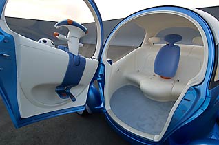 Wie schon beim bahnbrechenden Original-Pivo bildet auch beim Pivo II eine drehbare Kabine mit insgesamt drei Sitzplätzen das zentrale Rückgrat. „Drive-by-wire“-Technologien ersetzen bei Lenkung, Bremsen und Getriebe mechanische Verbindungen wie Antriebswellen oder Hydraulikzylinder durch elektrische Leitungen. Pivo II übernimmt alle fortschrittlichen Lösungen des Originals, wagt aber zugleich einen weiten Ausblick in die Zukunft der Mobilität. Nissan hat den Pivo II auch mit einer Reihe von Sicherheitssystemen auf Basis des „Safety Shield-Konzepts“* ausgestattet. Dazu zählen ein Rundum-Monitor (AVM) und ein Abstands-Kontrollsystem (DCAS). Roboter-Assistent sorgt für harmonische Partnerbeziehung Untersuchungen von Nissan haben ergeben, dass positiv gestimmte Fahrer weniger häufig in Unfälle verwickelt sind als schlecht gelaunte Zeitgenossen. Auf Basis dieser Erkenntnis zielte Nissan darauf ab, vom Auto selbst positive Schwingungen ausgehen zu lassen, um so eine harmonische Partnerbeziehung zu ermöglichen. Im Pivo II dient der Roboterassistent „RA“ als Vermittler zwischen Mensch und Auto. In dieser Funktion soll er Gefühle von Vertrauen und Zuneigung erzeugen. Das „Gesicht“ des Roboter-Assistenten lugt von der linken Seite des Instrumentenbretts in Richtung Fahrerplatz. Der Roboter-Assistent „spricht“ nicht nur mit dem Piloten, sondern hört ihm auch zu. Mit Hilfe der Konversation und neuartiger Technologien zur Gesichtskontrolle schließt der Roboter-Assistent auf die aktuelle Gemütsverfassung des Fahrers. Neben der Bereitstellung von Informationen, die für den Fahrbetrieb wichtig sind, ist er daher auch darauf programmiert, je nach Situation den Pivo II-Fahrer entweder aufzuheitern oder zu beruhigen. Um eine gelassene und zufriedene Grundstimmung zu erzielen, macht der Roboter zusätzlich mit intuitiv verständlichen Gesten auf sich aufmerksam – wie einem Nicken oder Kopfschütteln. „Während des Entwicklungsprozesses fragten wir uns manchmal, was der Roboter-Assistent wohl gerade so denkt“, erinnert sich Masahiko Tabe, ein leitender Entwickler in der Nissan-Abteilung Advanced Vehicle Engineering. „Vor allem, wenn er einmal für längere Zeit still war und gar nichts sagte.“ Am Ende gelang es den Ingenieuren trotz gelegentlicher Schweigephasen des elektronischen Freundes, die Bande zwischen Pivo II und seinen Insassen zu stärken. Die interaktive Schnittstelle baut gegenseitig Vertrauen auf und fördert so ein sicheres und genussvolles Fahren. Ein Design wie ein lebender Organismus Neben seiner Funktion als rollendes Prüflabor für den Einsatz von Robotern in den Autos von morgen besticht der Pivo II durch sein intelligentes Raumkonzept. „Normalerweise müssen beim Design eines neuen Autos viele das Package betreffende Fragen berücksichtigt werden. Wie zum Beispiel die Einbaulage der Frontscheinwerfer und der Heckleuten“, gibt Chefdesigner Masato Inoue zu bedenken. „Beim Pivo II mussten wir nicht mit solchen Einschränkungen leben, sondern betrachteten das gesamte Auto als einen intelligenten, lebenden Organismus. Daher geriet Pivo II für uns zu einem Experiment, wie wir es bei Nissan noch nie zuvor versucht haben.“ Schon das Exterieur des auf seine Betrachter extrem freundlich wirkenden Pivo II setzt ein starkes Design-Statement. Scheibenförmige Radnabenmotoren an allen vier Rädern machen die Installation von Antriebsaggregaten im Innern der Karosserie überflüssig. Das spart ebenso Bauraum wie der Einsatz kompakter Lithium-Ionen-Batterien und die in jedem Motor integrierten Drehrichter. Dank der komplett drehbar auf dem Fahrgestell gelagerten Kabine können Passagiere aus jeder beliebigen Richtung in den Pivo II einsteigen. Fahrer und Beifahrer gelangen so bequem ins Innere wie sonst nur ins eigene Wohnzimmer. Haben sie in ihrem Sitz Platz genommen, umgibt sie eine ausgesprochen angenehme, lichtdurchflutete Atmosphäre. . Der Fahrersitz ist zentral angeordnet, dahinter finden zwei weitere Reisende auf einer im Stil eines Clubsessels gehaltenen Sitzbank Platz. Um Ein- und Ausstieg zusätzlich zu erleichtern, ist der Instrumententräger in die elektrisch betätigte Vordertür integriert; zugleich fährt beim Öffnen der Tür die Lenksäule nach oben. Das RA-System ist an der linken Seite des Instrumententrägers untergebracht, rechts davon sitzt ein LCD-Multifunktions-Bildschirm. Einzigartige Mobilität: Unterhaltsam, komfortabel – und notfalls auch mal seitwärts Zu den Grundvoraussetzungen eines Stadtautomobils gehören einfaches und komfortables Manövrieren, leichtes Einparken und die Fähigkeit, auch enge Straßen ohne Kollisionsgefahr zu meistern. Bei der Realisierung der wie schon beim Pivo I drehbar gelagerten Fahrgastzelle half Nissan neben fortschrittlichen By-wire-Techniken das „Metamo“-System, welches flexible geometrische Änderungen ermöglicht. Wenden oder rückwärts fahren ist damit nicht mehr nötig – es reicht, die Glaskuppel in die gewünschte Richtung zu drehen. Dank des streng symmetrisch ausgelegten Unterbaus schaut der Fahrer beim Fahren so immer nach vorne. Durch eine individuelle Steuerung der Elektromotoren kann der Pivo II auch für ein konventionelles Modell unmögliche Manöver ausführen. Da alle vier Motoren einzeln und unabhängig voneinander aktivierbar sind, kann sich der Cityfloh bei Bedarf wie ein Krebs seitlich bewegen – ein großer Vorteil beim Ansteuern sehr enger Parklücken oder beim Navigieren im dichten Stop-and-Go-Verkehr. Das Metamo-System kann aber noch mehr, als „nur“ die Fahrtrichtung des Pivo II flexibel zu verändern. Es kontrolliert zusätzlich die Stellung der Räder in Abhängigkeit zu den aktuell anliegenden Fahrbedingungen, was sowohl die dynamische Leistung wie auch die aktive Sicherheit verbessert. Dazu werden die Räder beim Beschleunigen rückwärts, beim Bremsen vorwärts und bei Kurvenfahrt zum Kurvenaußenrand hin bewegt. Effekt: Durch den besseren Ausglei