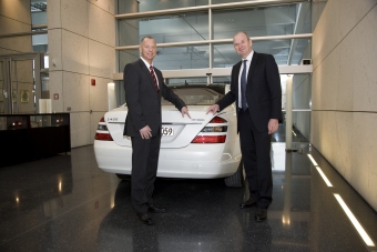 Hans-Peter Villis, Vorstandsvorsitzender der EnBW Energie Baden-Württemberg AG (rechts), nimmt einen Mercedes-Benz S 400 BlueHYBRID von Jochen Dimter, Leiter Flottenmanagement Pkw der Mercedes-Benz Vertriebsorganisation Deutschland (links), im Center of Excellence in Sindelfingen entgegen Berlin/Stuttgart - Hans-Peter Villis, Vorstandsvorsitzender der EnBW Energie Baden-Württemberg AG, hat sich für einen zukunftsweisenden Dienstwagen entschieden: einen Mercedes-Benz S 400 BlueHYBRID, das erste Hybridfahrzeug mit Lithium-Ionen Batterie. Mit einem Verbrauch von 7,9 Litern pro 100 Kilometern und einem CO2-Ausstoß von 186 Gramm pro Kilometer ist der S 400 BlueHYBRID die sparsamste Luxuslimousine mit Ottomotor und CO2-Weltmeister der Luxusklasse. Das Modell kommt im Sommer 2009 auf den Markt.