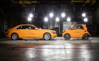 „Die Stabilität der Fahrgastzelle wird durch den hohen Anteil an ultrahochfesten Stählen sichergestellt. Darüber hinaus bieten die weiterentwickelten Airbags und Sicherheitsgurte bestmöglichen Schutz für die Insassen, unter anderem durch einen serienmäßigen Kniebag für den Fahrer.“ Im Sinne der Sicherheitsphilosophie „Real Life Safety“ untersucht Mercedes-Benz seit vielen Jahren bei derartigen car-to-car-Crashtests die Kompatibilität unterschiedlicher Unfallgegner. Kleine und leichte Fahrzeuge sind in Bezug auf das Massenverhältnis prinzipiell im Nachteil. Kommt es beispielsweise zu einem Unfall mit einem schwereren Gegner, kann dies zu höheren Verzögerungen und zu einem Anstieg der Insassenbelastungen führen. Darum legt Mercedes-Benz generell die Karosseriestruktur großer Fahrzeuge so aus, dass sie die Belastung auch für kleine Unfallgegner reduzieren kann, ohne dabei den eigenen Insassenschutz zu mindern. Schöneburg: „Damit liefert auch die S-Klasse einen hohen Beitrag zum guten Ergebnis in diesem Fahrzeug-Fahrzeug-Unfall.“ Photo: smart (16.07.2014)
