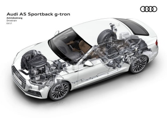 Angetrieben werden die neuen A4 Avant g-tron und A5 Sportback g-tron von einem 2.0-TFSI-Motor mit dem von Audi weiterentwickelten, hocheffizienten Brennverfahren („B-Zyklus“). Insgesamt haben die Ingenieure bei der Entwicklung 29 neue Bauteile und Materialien verwendet und das Aggregat auf den zusätzlichen Betrieb mit Gas optimiert. Die speziell angepassten Kolben und Ventile ermöglichen dabei eine optimale Verdichtung. Das Turboaggregat leistet 125 kW (170 PS). Bei 1.650 Umdrehungen pro Minute steht sein maximales Drehmoment von 270 Newtonmetern bereit. Ein elektronischer Regler verringert den hohen Druck des vom Tank einströmenden Erdgases von bis zu 200 bar auf 5 bis 10 bar Arbeitsdruck im Motor. Dieser Vorgang erfolgt dynamisch und präzise, entsprechend der vom Fahrer angeforderten Kraft. So steht in der Gasleitung und in den Einblasventilen stets der richtige Druck bereit – niedrig für effizientes Fahren im unteren Drehzahlbereich, höher für mehr Leistung und Drehmoment. Der Motor wurde unter extremen Temperaturbedingungen erprobt und durchlief in Skandinavien Tests bei minus 35 Grad. Für die im CNG Betrieb notwendigen Bauteile wurden zusätzliche Kälteschutzfunktionen entwickelt. Sie verhindern beispielsweise das Einfrieren der Gasventile. Für die problemlose Fahrt bei sommerlicher Hitze passten die Entwickler insbesondere Bauteile für den Benzinbetrieb an. So entwickelten sie eine Ventilhülse aus Edelstahl zum Schutz des Hochdruckeinspritzventils für Benzin. Das Bauteil kann sich durch die Verbrennung von CNG auf bis zu 400 ˚C erhitzen. In Summe haben die Audi-Ingenieure durch diese Maßnahmen eine für CNG-Motoren beispiellose Effizienz erreicht. Im NEFZ-Zyklus verbraucht der Audi A4 Avant g-tron mit der optionalen S tronic nur 3,8 Kilogramm CNG pro 100 Kilometer (102 Gramm CO2 pro Kilometer). Im Benzinbetrieb sind es 5,5 Liter pro 100 Kilometer (126 Gramm CO2 pro Kilometer). Die Werte für den A5 Sportback g-tron mit S tronic sind im CNG-Betrieb identisch. Nutzt er Benzin, sind es 5,6 Liter pro 100 Kilometer (126 Gramm CO2 pro Kilometer). Beide Modelle beschleunigen in 8,4 Sekunden von 0 auf 100 km/h. Der A4 Avant g-tron erreicht eine Höchstgeschwindigkeit von 221 km/h, der A5 Sportback g-tron 224 km/h. Die Gesamtreichweite der neuen Mittelklasse-Modelle liegt bei 950 Kilometern – bis zu 500 davon allein mit CNG. Dieser Treibstoff lagert in vier Tanks, die platzsparend im Hinterwagen verteilt sind. Hinzu kommt ein Benzintank, der 25 Liter fasst. Die Kraftstoffausgaben sinken gegenüber einem vergleichbaren Benzinmotor deutlich, auf rund vier Euro pro 100 Kilometer (Deutschland, Stand: September 2017). Auch zahlt der Halter durch die geringeren CO2-Emissionen eine niedrigere Kfz-Steuer. Besonders ökologisch fahren die g-tron-Modelle mit Audi e-gas. So verursachen sie im Vergleich zu einem Benziner in der gleichen Leistungsklasse 80 Prozent** weniger CO2-Emissionen. Für die Kunden bedeutet das keine Mehrkosten: Audi stellt allen g-tron-Kunden, die bis 31.05.2018 bestellen, den grünen Kraftstoff Audi e-gas drei Jahre lang serienmäßig zur Verfügung. Der Kunde tankt sein g-tron-Modell an jeder beliebigen CNG-Tankstelle und bezahlt dafür den regulären Preis. Audi sichert die grüne Eigenschaft und damit die entsprechende CO2-Reduktion, indem das Unternehmen im Hintergrund die berechnete Menge in Form von Audi e-gas wieder ins Erdgasnetz einspeist. Audi stellt das synthetische e-gas mithilfe erneuerbarer Energien her, aus Wasser und CO2 oder aus Reststoffen, wie Stroh und Grünschnitt. Dies geschieht unter anderem in der eigenen Power-to-Gas-Anlage im niedersächsischen Werlte. In der Produktion bindet Audi e-gas insgesamt genau die Menge an CO2, die das Auto emittiert. * Angaben in