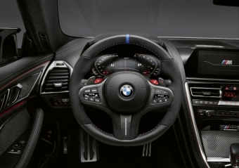 In bester Tradition sind dabei sämtliche Komponenten aufeinander und auf den spezifischen Charakter des Modells abgestimmt. Neben Auswirkungen auf die sportliche Optik erfüllen die Zubehör-Optionen auch funktionale Anforderungen in puncto Leichtbau und Aerodynamik. Dafür sorgt nicht zuletzt das umfassende Knowhow der BMW M GmbH, das in die Entwicklung der M Performance Parts einfließt. Exterieurkomponenten aus Carbon für nochmals markanteren Auftritt Als Ergänzung der optionalen Ausstattung Carbonpaket runden die M Performance Exterieurkomponenten Carbon die dynamisch-elegante Motorsportoptik des neuen BMW M8 ab. Während beispielsweise die M Performance Schwelleraufsätze dem Fahrzeug optisch mehr Länge verleihen, garantieren die M Performance Frontziergitter Carbon und M Performance Ziergitter Carbon Seite eine individuell markante Frontansicht. Die speziell für den BMW M8 entwickelten, aufeinander abgestimmten und in aufwendiger Handarbeit gefertigten Komponenten zeigen eine Sichtcarbon-Optik. Mit Klarlack versiegelt und hochglanzpoliert sind sie UV- und temperaturbeständig sowie waschanlagentauglich. Gleiches gilt für die M Performance Motorabdeckung Carbon, die bei geöffneter Motorhaube einen eindrucksvollen Blickfang im hochwertig-rennsportlichen Look darstellt. Für härteste Belastungen gerüstet: M Performance Sportbremsbeläge. Kürzerer Bremsweg, besseres Ansprechverhalten, höhere thermische Belastbarkeit: Die Vorteile der M Performance Sportbremsbeläge sind vielseitig. Direkt abgeleitet von den BMW Motorsport Langstrecken-Rennbelägen ermöglichen die Varianten für BMW M8 Coupé und Cabriolet zudem im Vergleich zur Serienkonfiguration rennsportorientiertes und besonders dynamisches Einlenken beim Anbremsen einer Kurve. Alles perfekt im Griff mit dem M Performance Lenkrad Pro