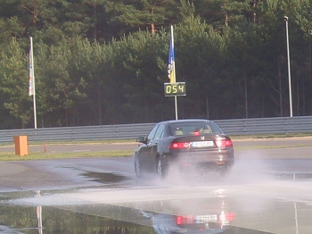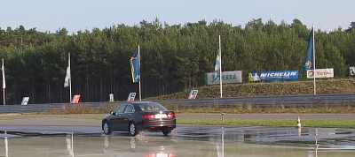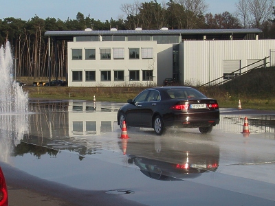 VSA im Accord eingeschaltet und Vollgas, der Accord zog seine Runden wie auf Schienen. Wieder war es nur eine Frage der Lenkkraft, das Fahrzeug in der Bahn zu halten. Hier hatten wir die erste Anfrage eines anderen Teilnehmers, ob er mal eine Vollgasrunde mitfahren könnte. Gerne! Der Swift machte hier keine so gute Figur, das Stabilitätssystem vermisste man doch deutlich. Beim Notbremsen auf nasser Straße mit Lenkübungen kam natürlich der Spaßfaktor beim Swift zum tragen. Der sichere Accord bestand die Übungen ohne Mühe. Anders ging es wieder auf dem großen Rundkurs zu. Der Accord hatte bei jeder Runde Fahrgäste und tat sein bestes um mit hoher ausbalancierter Geschwindigkeit seinen Insassen ein sportliches, aber zugleich sicheres Gefühl zu vermitteln. Egal, wie sehr man aufs Gaspedal drückte, das VSA hielt den Wagen in der Spur! Fazit: Auf der Rückfahrt nach Berlin wusste man dann, einen Accord bringt nichts aus der Ruhe. Es darf auch ruhig mal eine bisschen ruppiger zugehen. (Berlin November 10, 2006)