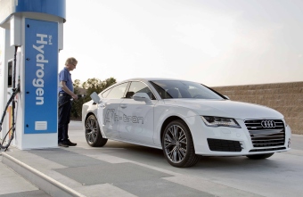 Audi Brennstoffzellen-Technologie A7 h-tron Einzigartig ist die innovative Audi-Erdgasproduktion in Werlte/Emsland. Windstrom spaltet dort Wasser in Sauerstoff und Wasserstoff. Wasserstoff und Kohlendioxid CO2 reagieren zu synthetischem Methan. Das erforderliche CO2 stammt aus Bioabfällen. Es kann auch aus der Luft entnommen werden. Eine Konkurrenz zwischen Teller und Tank besteht deshalb nicht. Im Fahrbetrieb entsteht bei der Verbrennung im Motor kein Gramm CO2, das nicht vorher bei der e-gas-Herstellung gebunden wurde. Mittelfristig kann sogar die deutsche Energiewirtschaft vom Konzept der Audi e-gas-Produktion profitieren, denn es beantwortet die offene Frage, wie sich Ökostrom effizient und ortsunabhängig speichern lässt. Weht viel Wind, lassen sich Strom-Überkapazitäten in Audi e-gas wandeln und im öffentlichen Gasnetz einlagern. Aus dem Gasnetz kann man die Energie dann, wenn gewünscht, jederzeit durch Rückumwandlung ins Stromnetz zurückführen. Intensiv arbeitet Audi mit Partnern an der Herstellung von synthetischem Ethanol und synthetischem Diesel. Mit Hilfe von Sonnenenergie werden aus CO2 und Brauchwasser flüssige Kraftstoffe erzeugt. Im Mittelpunkt dieses Prozesses stehen photosynthetische Mikroorganismen, die kontinuierlich Kraftstoff produzieren. Audi hat an den Technologie-Patenten Exklusivrechte erworben. Allein auf die Wüsten in Nahost und Nordafrika strahlt die Sonne übers Jahr mit einer Energie, die dem Dreißigfachen dessen entspricht, was jährlich weltweit an Elektrizität erzeugt wird. Daher lautet das Ziel eines weiteren Projekts, in den Wüsten Nordafrikas und des Nahen Ostens klimafreundliche Solarenergie zu erzeugen.