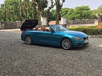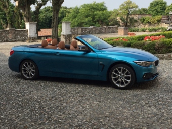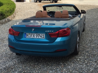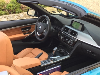 Das Interieur des BMW 4er Cabrio strahlt sportliche Eleganz aus und ist BMW typisch fahrerorientiert konzipiert. Die Kombination der Außenlackierung in „Snapper Rocks Blue“ mit der Lederausstattung Dakota Cognac wirkt edel und strahlt Sommerfeeling pur aus. Edle Ziernähte, Details in Klavierlackoptik, gebürstete Chromleisten, alles zeugt von hochwertiger Verarbeitung. Die Komfortsitze mit integrierter Gurtführung und elektrischer Sitzeinstellung garantieren die perfekte Sitzposition. Der effektive Überrollschutz sorgt dafür, dass im Falle eines Unfalls zwei massive Aluminiumelemente innerhalb von unter 200 Millisekunden aus dem Heck des Fahrzeuges schnellen.